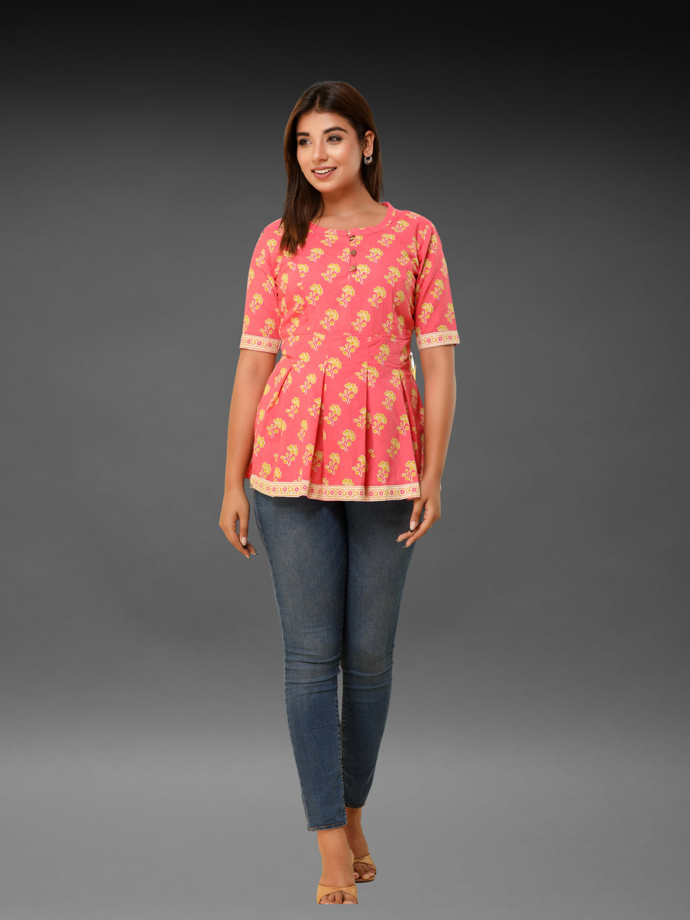 Introducing our Jaipuri Floral Printed Peplum Top, designed to add a touch of traditional elegance to your wardrobe. This top features a stylish round neck with a chic mandarin collar, comfortable half sleeves, and a convenient button closure for easy wear. Perfect for casual outings and festive events.