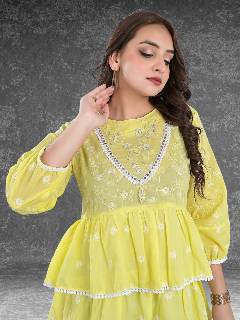 Elevate your vacation and party style with our Cotton Jaipuri Tunic. Featuring a round neck and exquisite thread motif embroidery on the top and three-quarter sleeves, this tunic is adorned with delicate lace work on the edges. Perfect for both parties and vacations, it combines traditional elegance with modern flair. Shop now to add this versatile piece to your wardrobe!